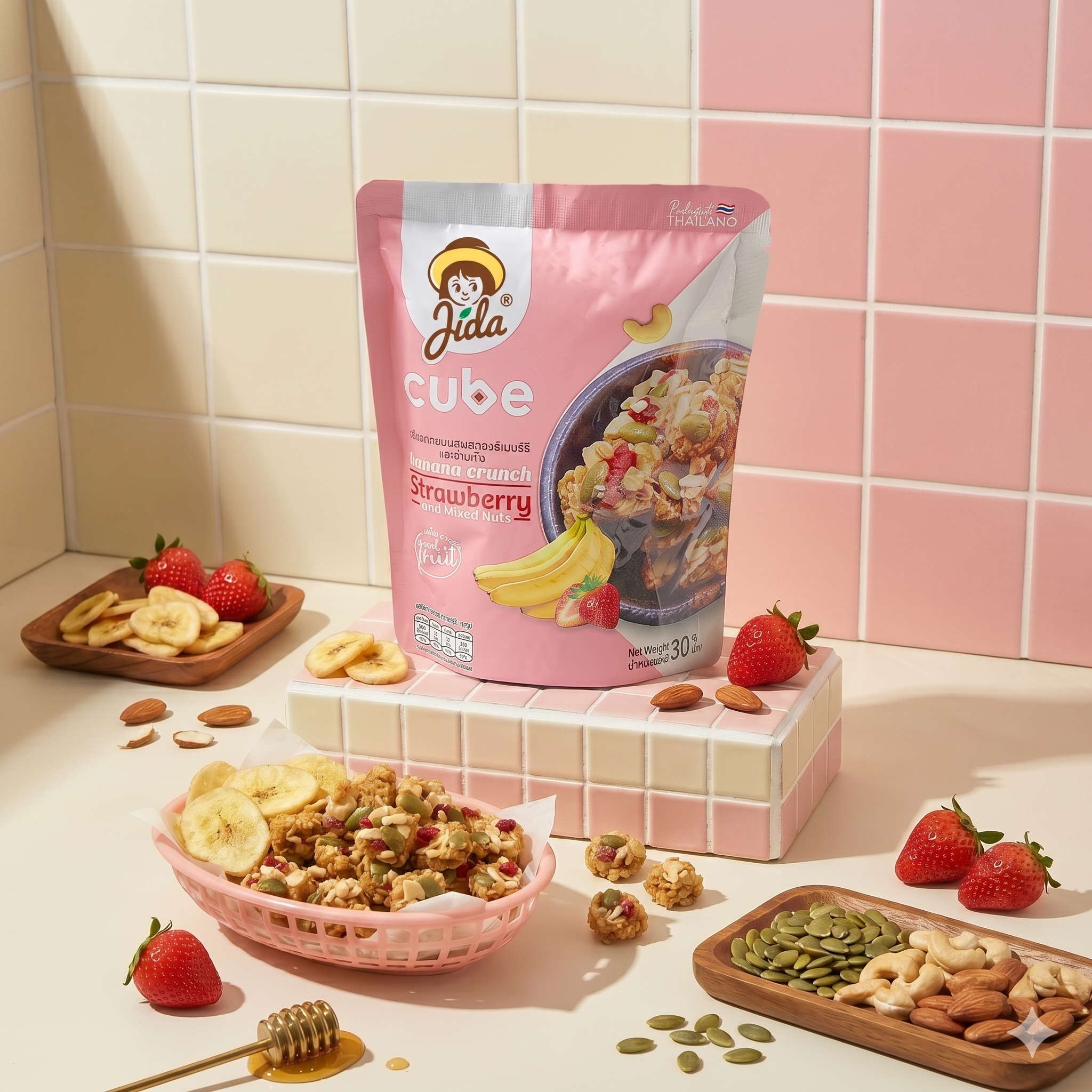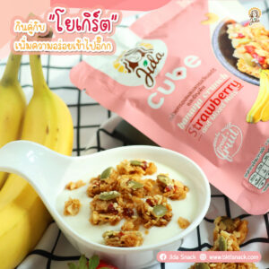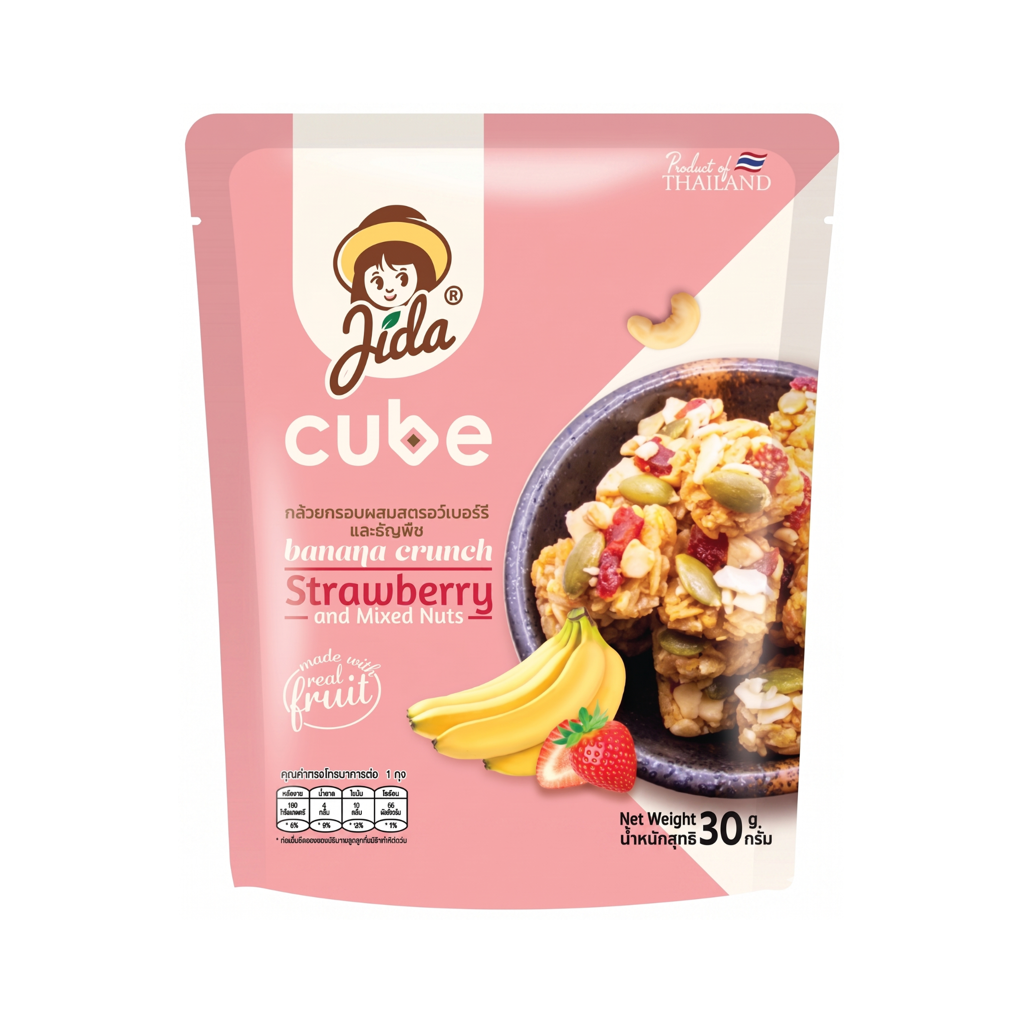 กล้วยกรอบผสมสตรอว์เบอร์รีและธัญพืช ตรา Jida Cube ขนาด 30 กรัม